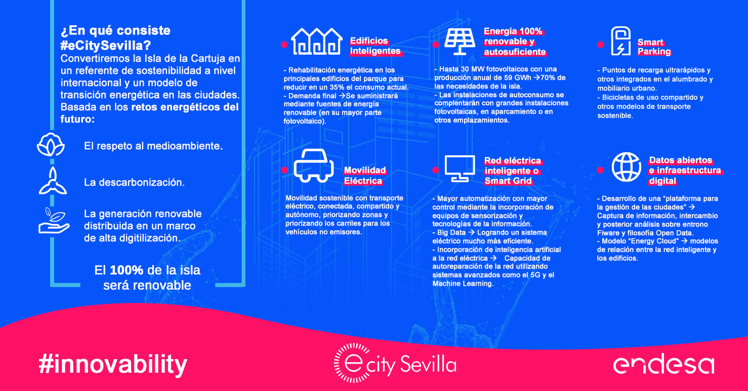 Todo puede hacerse realidad gracias a #eCitySevilla, una iniciativa de colaboración público-privada liderada por Endesa, el Parque Científico y Tecnológico Cartuja, la Junta de Andalucía y el Ayuntamiento de Sevilla. El objetivo es que sea capaz de generar energía cien por cien renovable con almacenamiento, además de aumentar en un treinta y cinco por ciento la eficiencia energética de aproximadamente cincuenta edificios inteligentes y lograr que el veinte por ciento del parque móvil sea totalmente eléctrico en 2025.